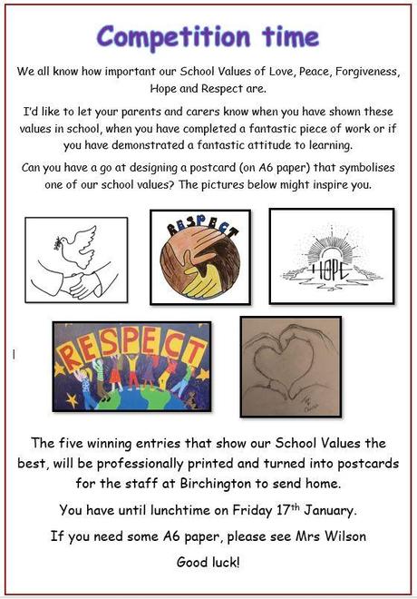 With over 150 entries to our School Values postcard competition, we have 5 very worthy winners. They will be professionally printed and sent to parents and carers to let them know when their child has really demonstrated our school values, produced a really fantastic piece of work or because we really want to celebrate them for always doing the right thing. Well done Phoebe, Macey, Emily, Eden and Edie!