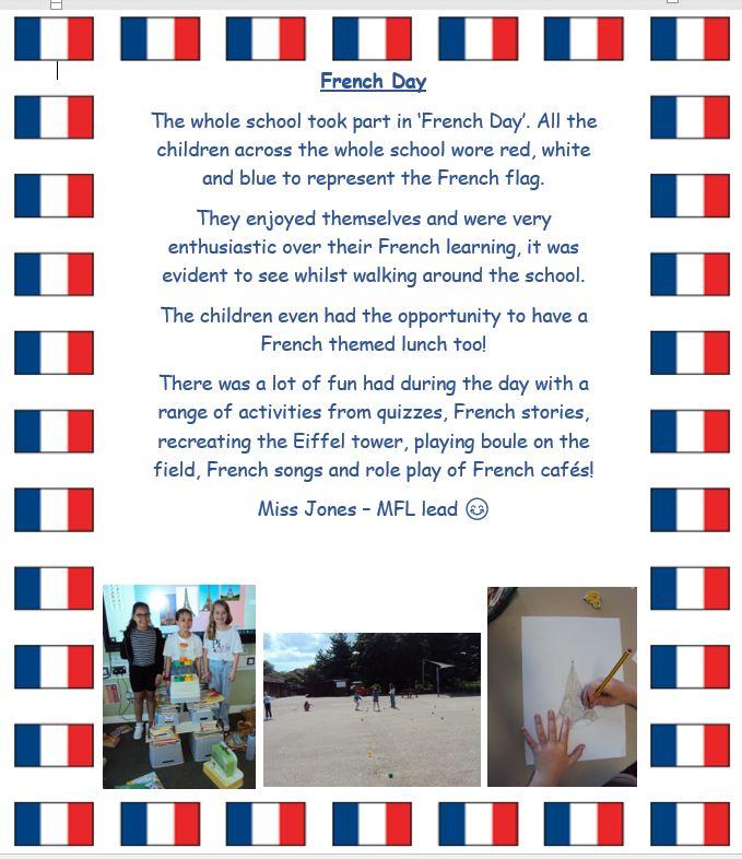 Last year, we had a French theme day with a native French speaker, a teacher from a local secondary school. This provided our children with a valuable real-life experience and the opportunity to hear and communicate with a native French speaker.