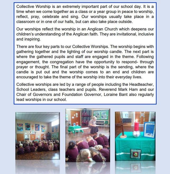 Following the words of our Christian Vision, we ensure that our worship leaders plan and deliver aspirational worships that celebrate and respect all our pupils. Like our chosen Bible parable of The Lost Sheep, we aim for all our pupils to flourish and feel safe; we ensure that all our worships are invitational and inclusive to include all our pupils. Our worship reflects the variety of traditions found in the Church of England, and will recognise and follow the Christian liturgical year. The daily Christian act of worship is central to our ethos and is supported by all staff and Governors. It makes an important contribution to the overall spiritual, moral, social and cultural development of the whole school community.