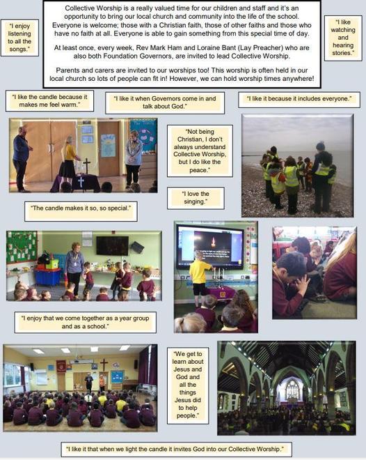 Each adult and pupil will experience worship that is truly welcoming, inclusive and exemplifying the principles of Christian hospitality. Collective worship therefore will be: