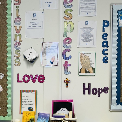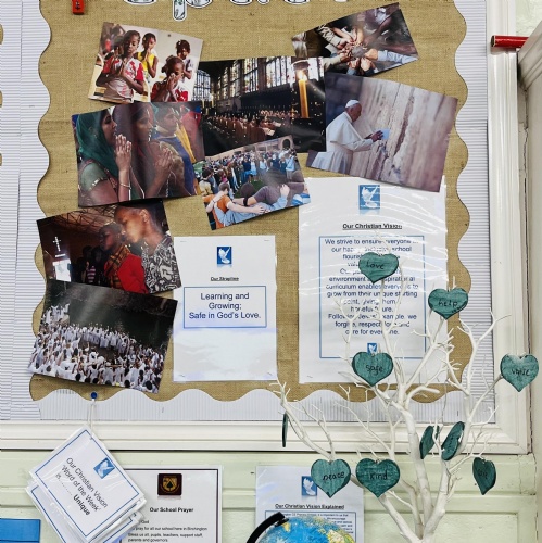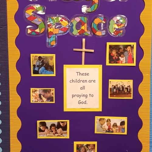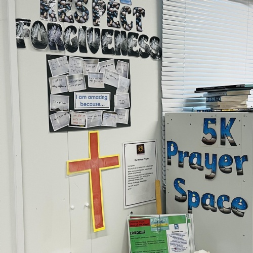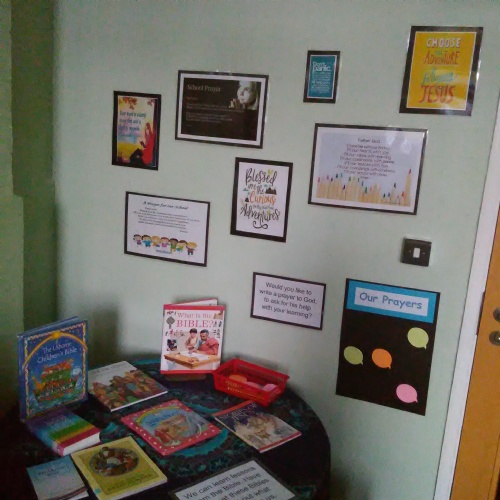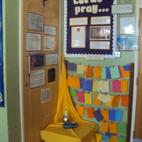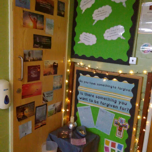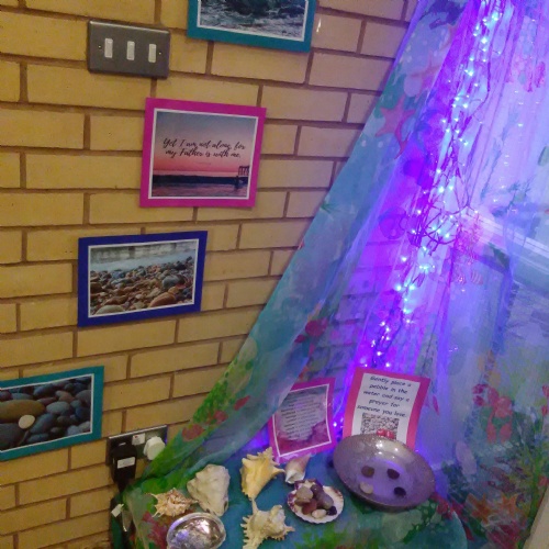 As well as every classroom having its own Prayer Space, we also have a number of Prayer Spaces in communal areas around the school. These areas are for any pupil or adult to use and enjoy. We have designated times throughout the year where groups of staff work together to create these areas. They would normally be interactive but our most recent areas have been more of a reflective display to ensure everyone is kept safe. Please see below for some examples of our communal Prayer Spaces.