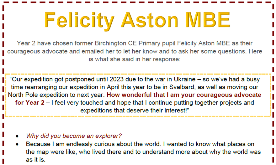 Feedback from our Year 2 Courageous Advocate - Felicity Aston MBE