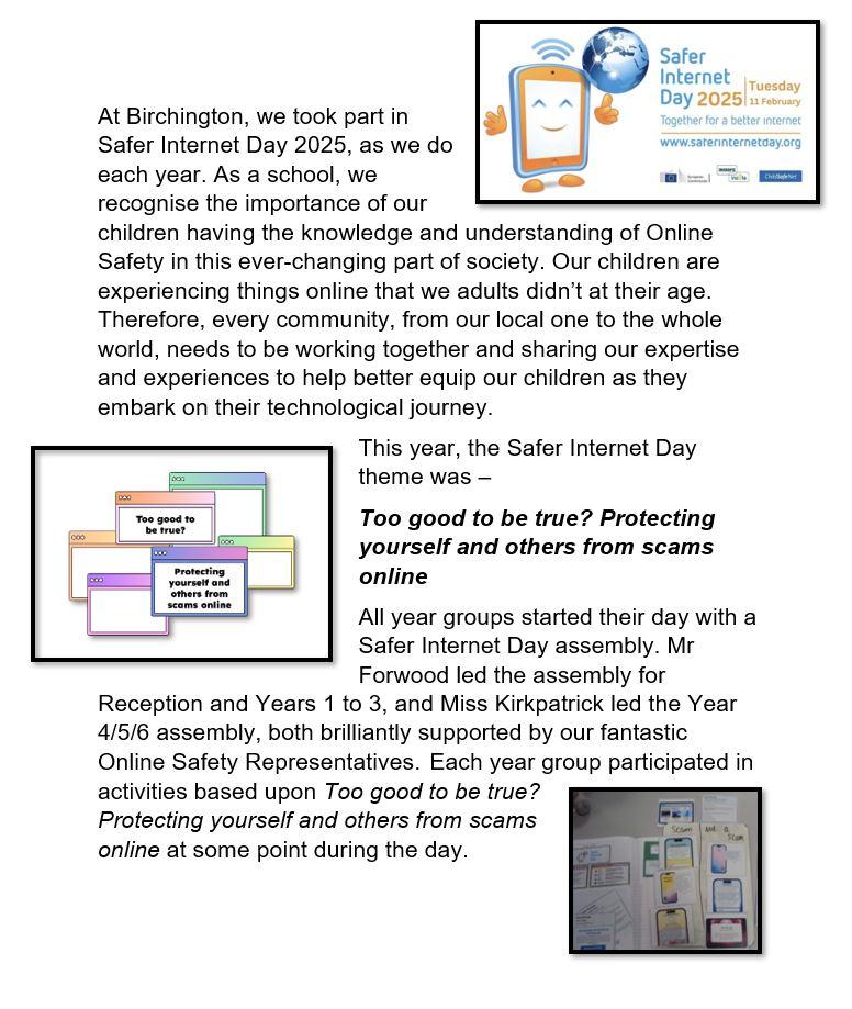 Today was Safer Internet Day at Birchington CEP School and at lots of other schools across the country. We started off with an assembly all about this year’s theme of ‘Too good to be true? Protecting yourself and other from scams online’ which was run entirely by our E-Safety Reps (with a little preparation help from Miss Kirkpatrick). Children across the school took part in a BBC live lesson, Year 5 and 6 were visited by our local PCSO, there were lots of activities that the children did in class and Year 2’s ‘Come and See’ session was all about Safer Internet Day! There was so much great learning that took place across the school on Online Safety, which is such a key aspect of growing up today.