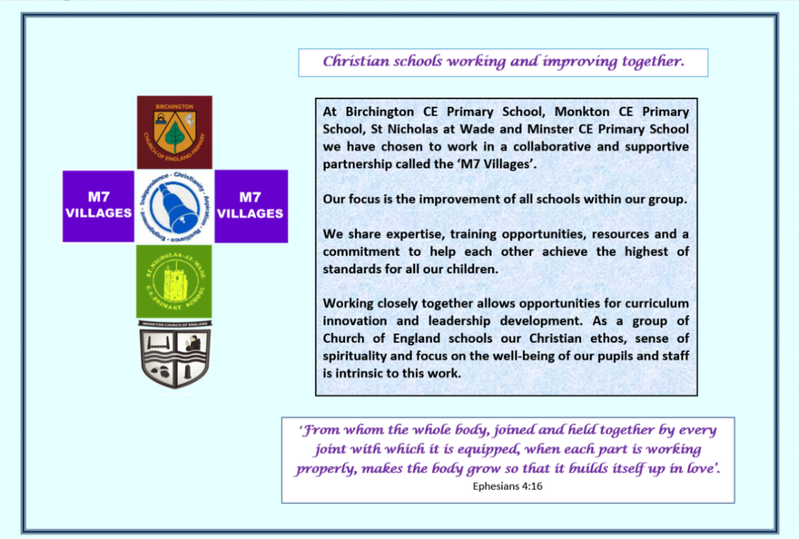 The Headteacher's of Monkton CE Primary, Minster CE Primary and Birchington CE Primary all meet together every term. Our exciting projects this year include a Shared Spirituality Day, Forest School, Geography field work and sports. We are also completing joint moderation in Writing and Maths.
